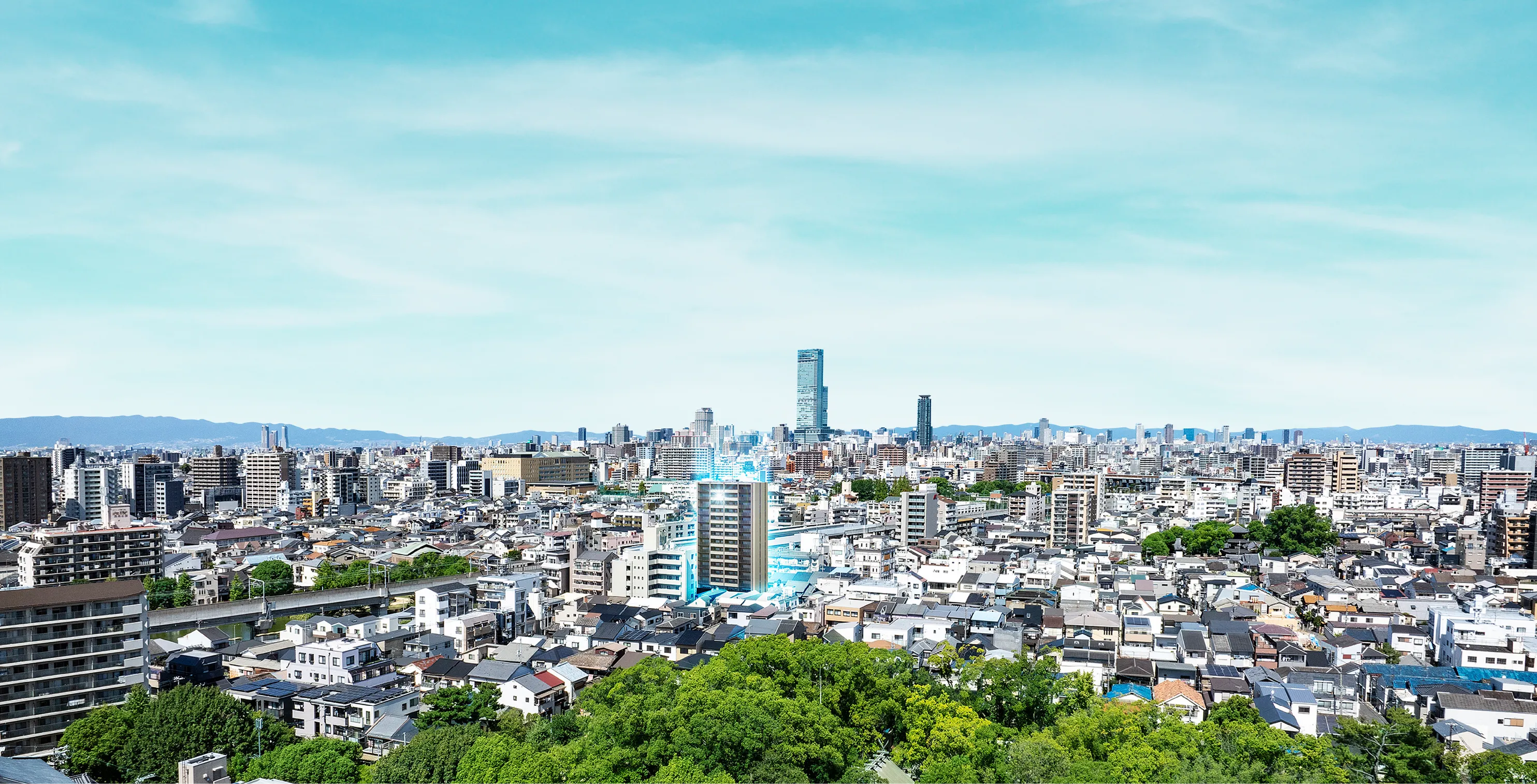 ※掲載の航空写真は、2024年9月に撮影したものに外観完成予想図を合成したもで、実際の見え方とは異なります。完成予想図は図面を基に描き起こしたもので、外観・外構・植栽・色彩等は実際とは異なる場合がございます。行政官公庁の指導、施工上の都合及び改良のため設計・仕様・外構工事等に変更が生じる場合があります。