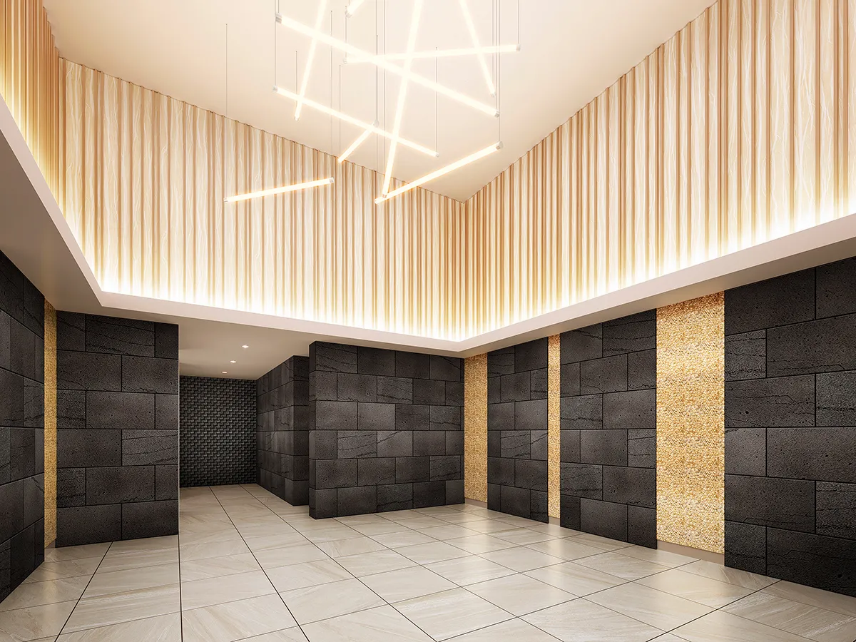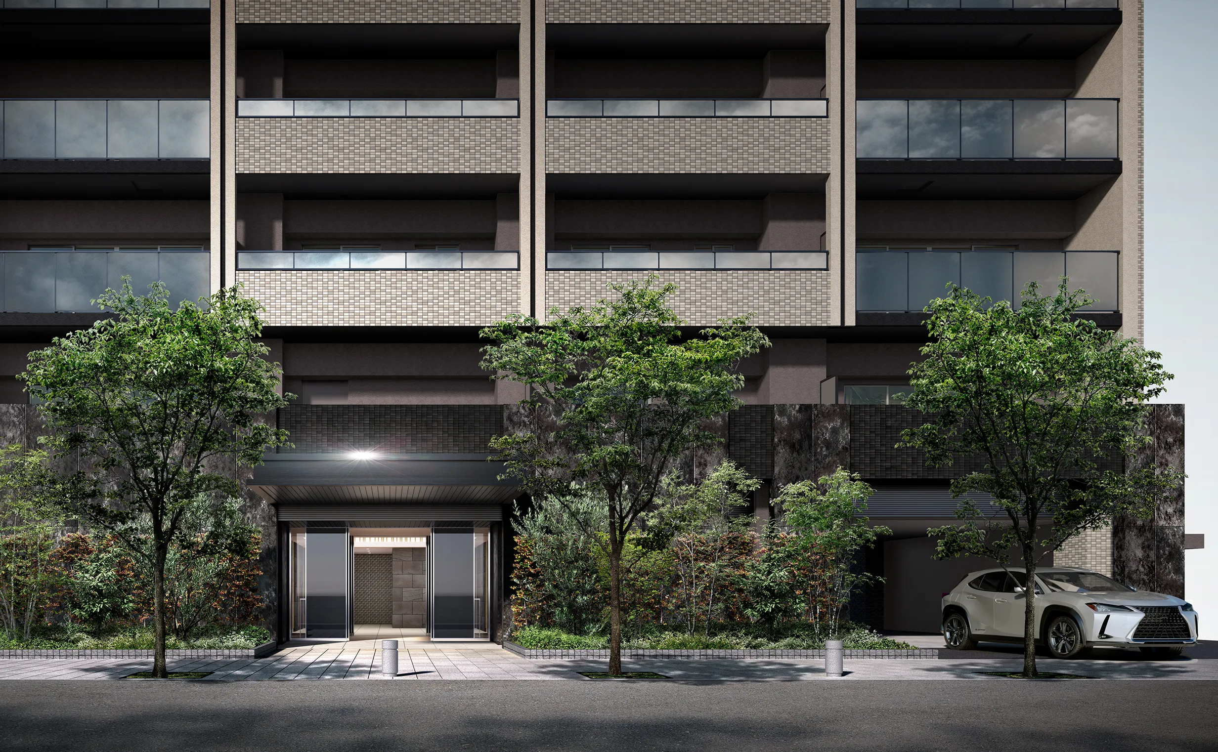 スタイリッシュで風格を漂わせる佇まいを追求し、二丁掛タイルや大判タイル、ガラス手すりなど、上質なマテリアルを厳選。エントランスホールには、磁器質タイルや玄武岩の大判タイル、せっ器質タイルなど、温かみと高級感のあるマテリアルでしつらえた美しい空間を創造しています。