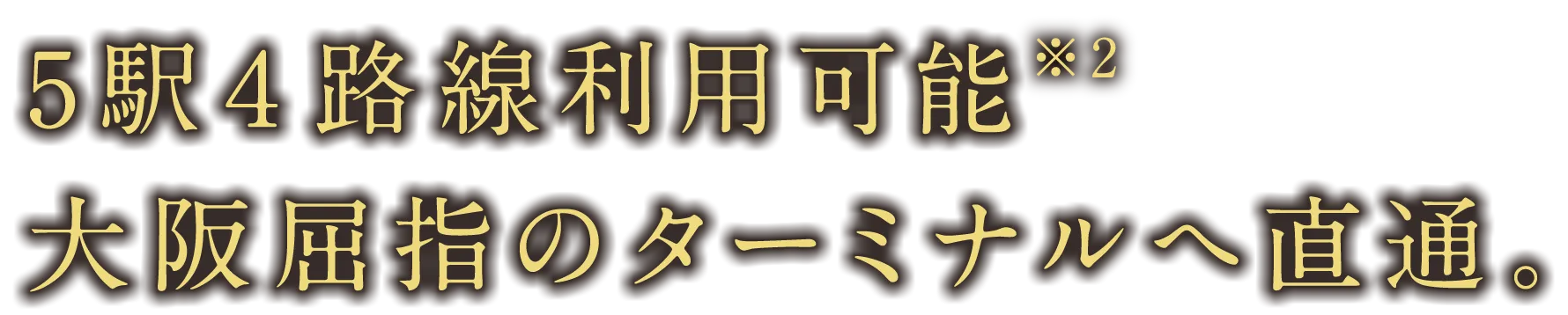 ※2:5駅4路線は阪神本線「淀川」駅徒歩8分(現地より約620m)、阪神本線「野田」駅徒歩11分(現地より約830m)、Osaka Metro千日前線「野田阪神」駅徒歩9分(現地より約720m)、JR東西線「海老江」駅徒歩11分(現地より約840m)、JR大阪環状線「野田」駅徒歩13分(現地より約980m)が利用可能なことを指します。(2024年6月調べ)