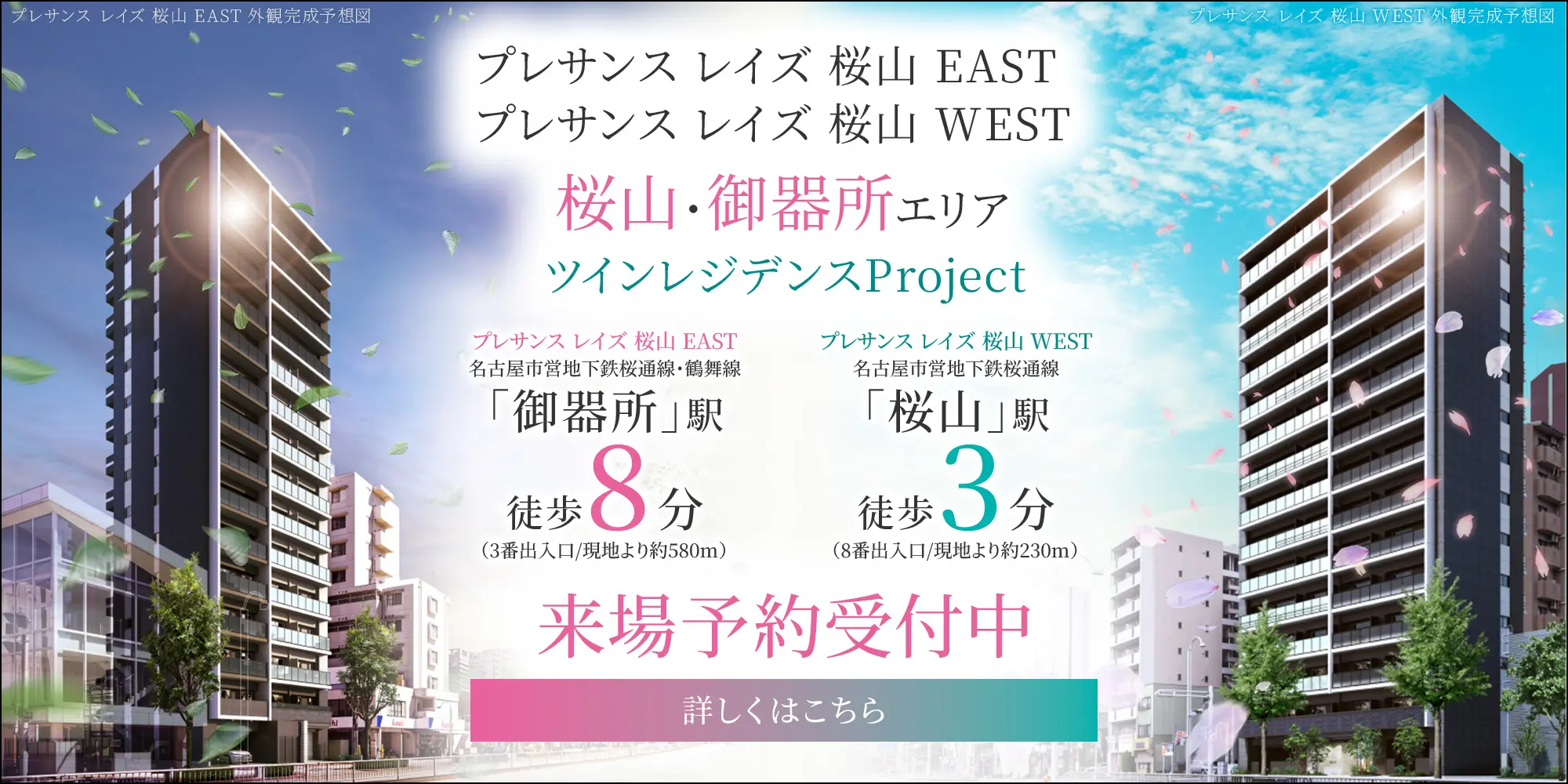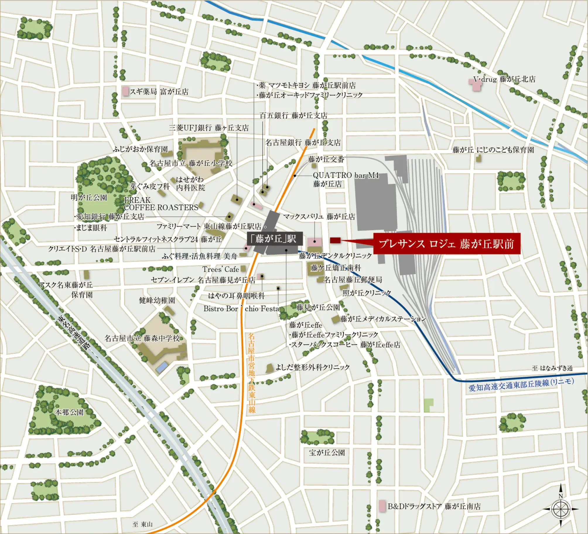 - ※1:愛知高速交通リニモ「藤が丘」駅(徒歩2分/現地より約140m/2番出入口)、名古屋市営地下鉄東山線「藤が丘」駅(徒歩3分/現地より約220m/3番出入口)。「駅前」とは最寄駅より徒歩3分以内の物件であることを表現しています。