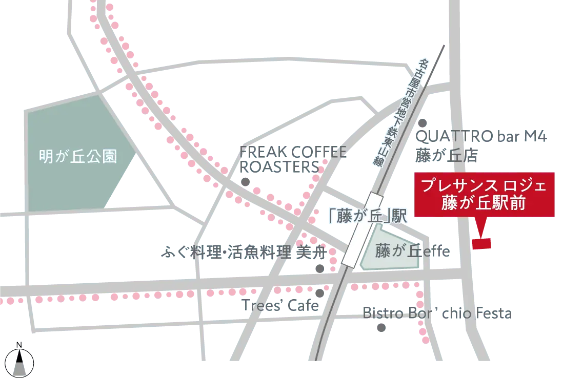 - ※1:愛知高速交通リニモ「藤が丘」駅(徒歩2分/現地より約140m/2番出入口)、名古屋市営地下鉄東山線「藤が丘」駅(徒歩3分/現地より約220m/3番出入口)。「駅前」とは最寄駅より徒歩3分以内の物件であることを表現しています。