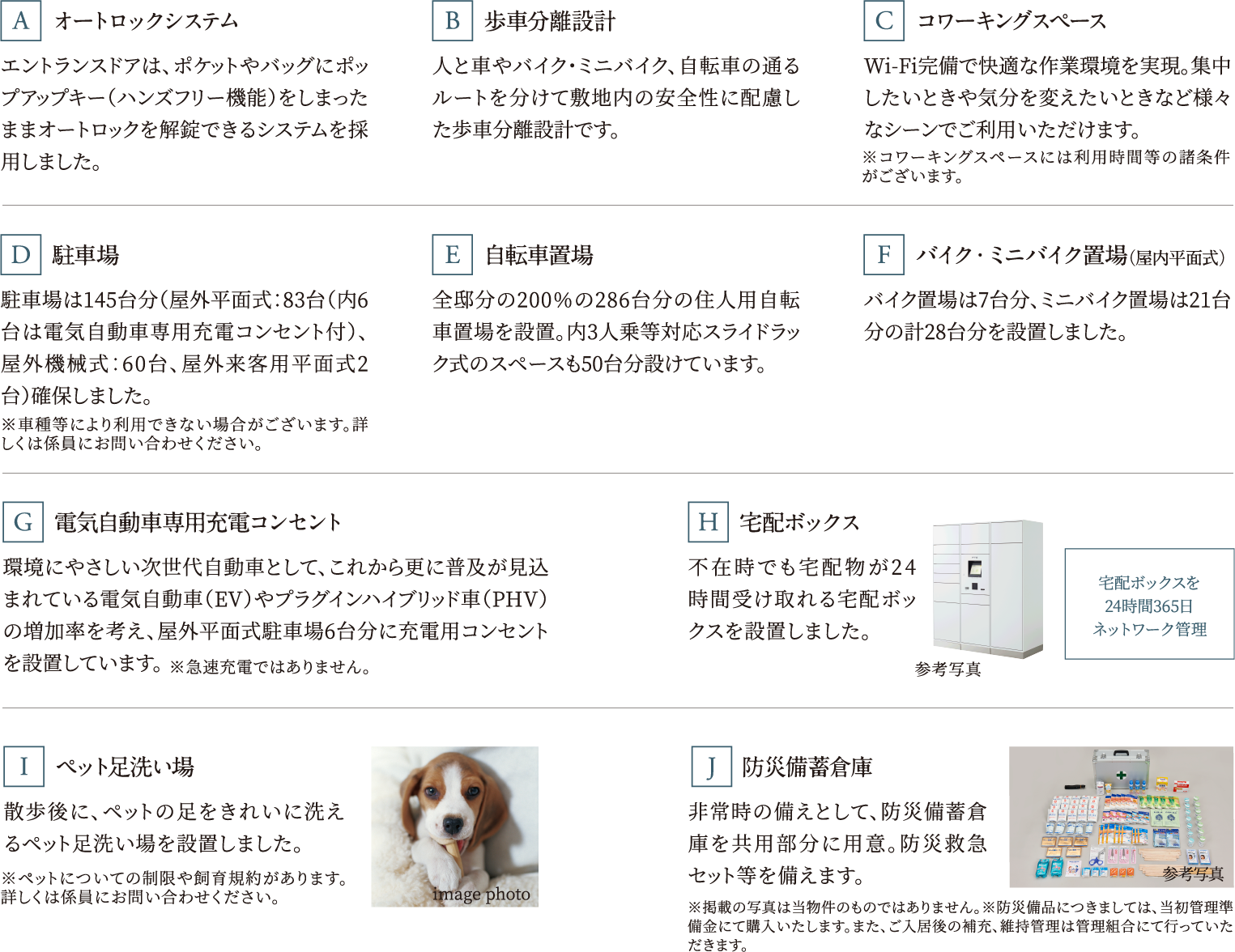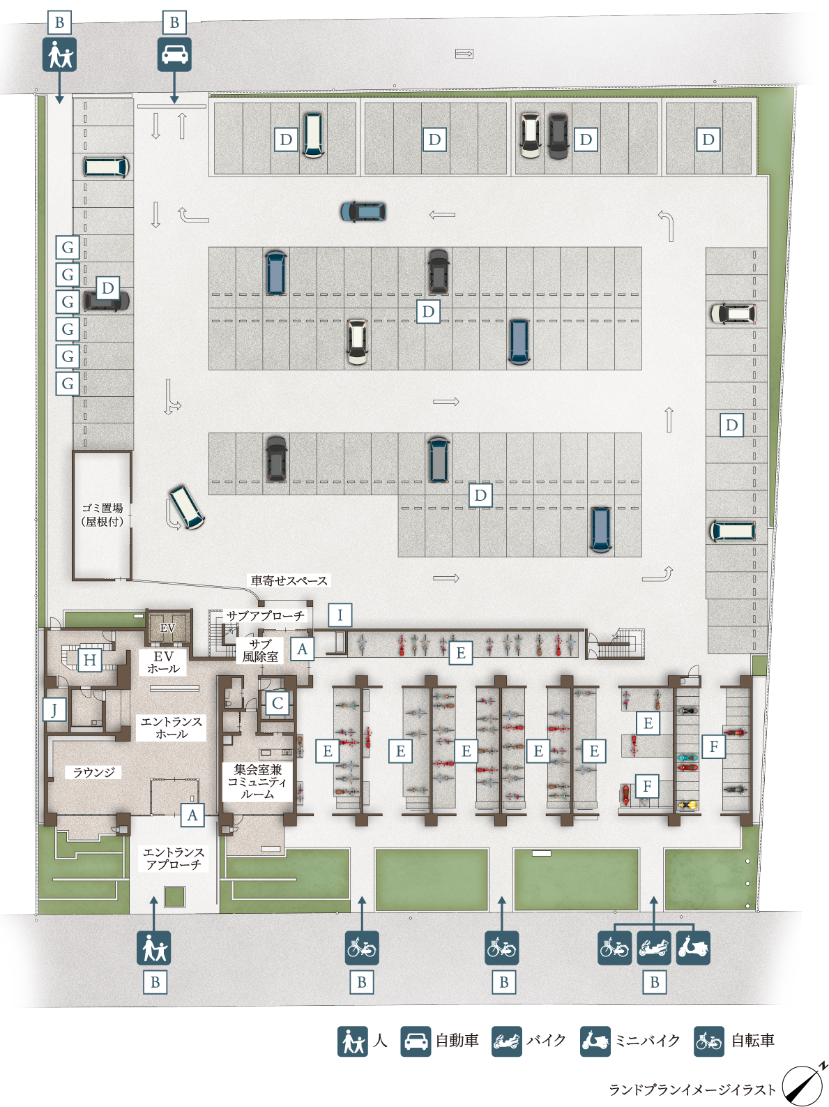 人と車・バイク・ミニバイク・自転車の進入ルートを分離。