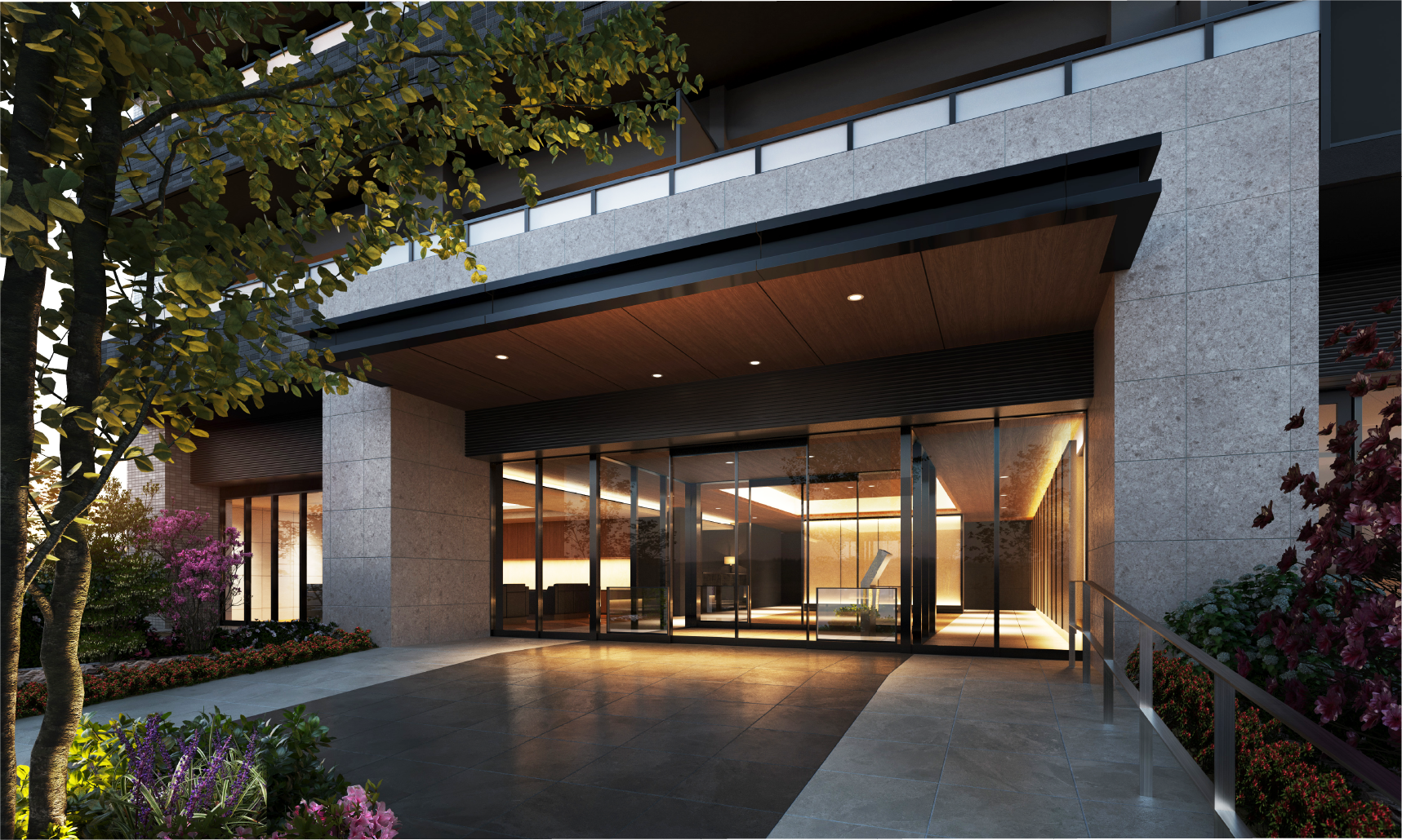 ゆったりとした広がりを持たせ、しかも街路からの奥行きも確保した、私邸感が際立つエントランスアプローチ。温もりのある木目調素材を採用した大きな庇を設え、壁面や床面を大判タイル貼りで仕上げ、揺るぎない品格を演出。左右と中央部に設けた植込が和らぎをもたらします。