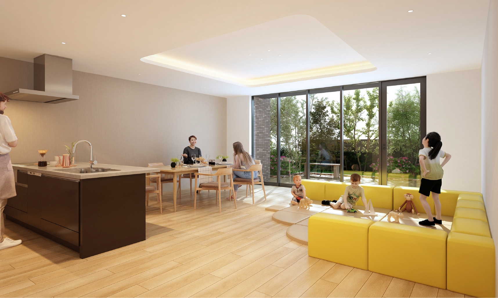 共用部の集会室兼コミュニティルームは、本格的なシステムキッチンも設置しており、パーティールームとして住まう方が自由に利用することが可能。ゆったりとした空間には爽快な室内環境を創出するワイドな開口部を設けたほか、自然の光と風を感じて過ごせる、ベンチを配した屋外空間もご用意しています。