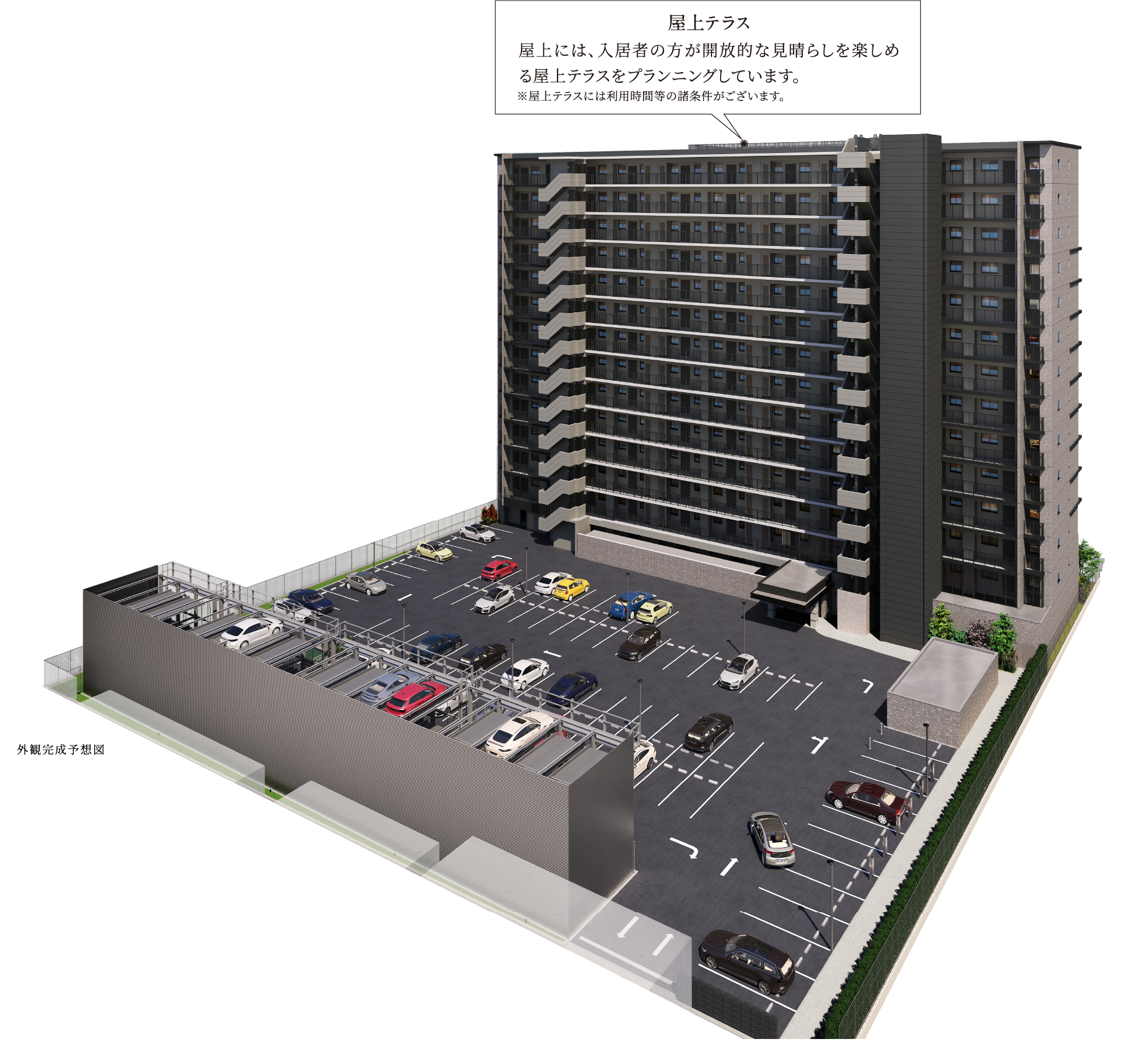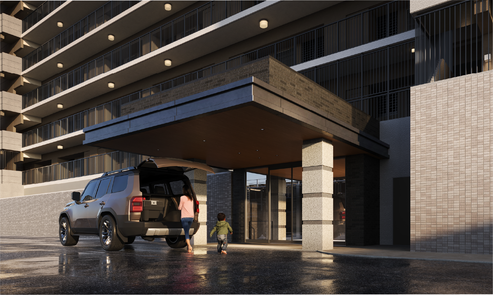 駐車場からスムーズに入館できるよう、建物の駐車場側にサブアプローチをご用意。庇を大きく張り出させた車寄せを設けており、雨天時も同乗者の乗り降りや荷物の積み下ろしの際に雨の影響を受けにくく、より快適なカーライフを実現します。