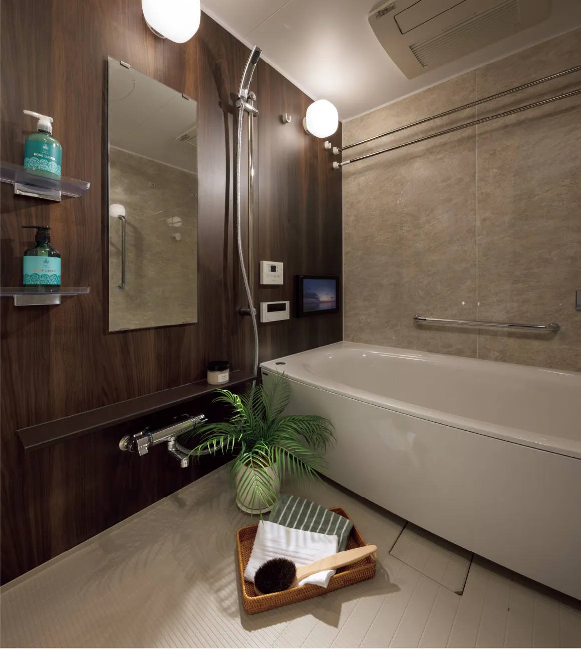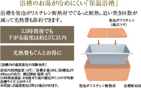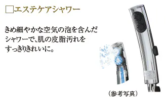 設定された湯温を安定的にキープして供給するサーモスタット付混合水栓。湯温を簡単に調節できます。また、シャンプーなど小物も置ける浴室カウンターも設置しています。