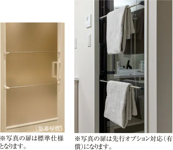 浴室ドアの外側にはタオル掛けを2段に設置。2枚のバスタオルを同時に掛けて、用途に応じて分けて使うことができます。