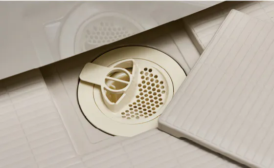浴室の排水口には、髪の毛を絡みにくくしたフィルターを採用。排水口にたまった髪の毛もフィルターをひっくり返すことで簡単に捨てられます。