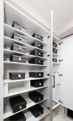 タオル類などの収納に便利なリネン庫をパウダールームに設けました。