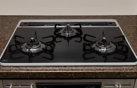 艶があって美しく、汚れが落ちやすくお手入れしやすいグリル付3口ガスコンロ。
