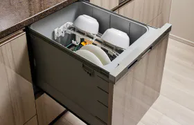 食器の出し入れがしやすいスライド収納タイプの食器洗い乾燥機。家事負担の軽減を図れます。
