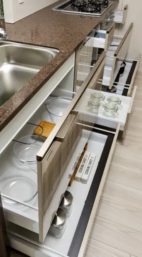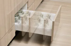 スライド式収納にはゆっくりと静かに閉まるソフトクローズ設計を採用(一部除く)。食器やガラス製容器も安心して収納できます。