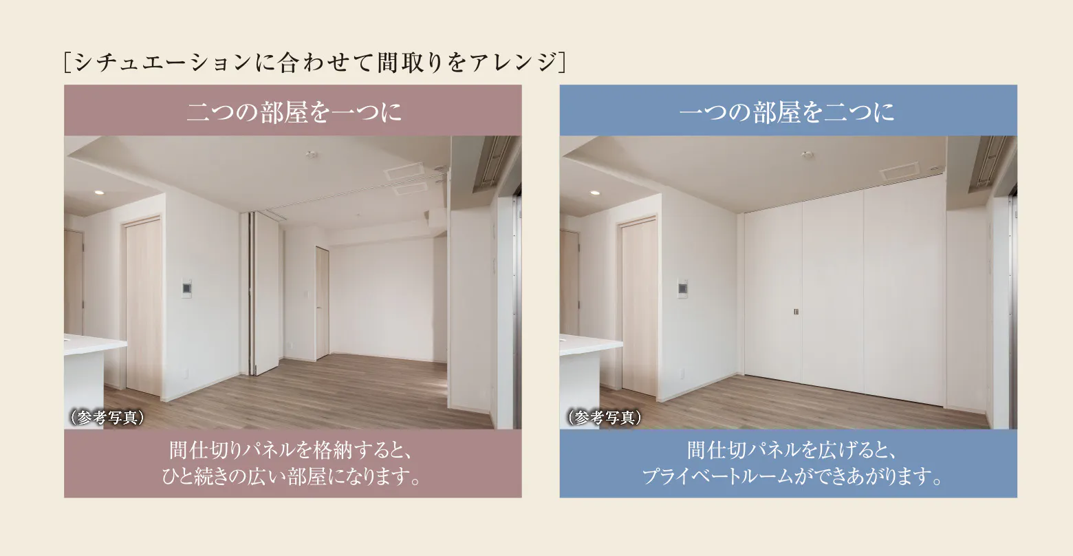 壁として使用する間仕切りパネルの一部は出入口として使用でき、部屋と一体感のあるデザインを採用。また、パネルを片側に集約することで部屋を拡大して使用することができます。