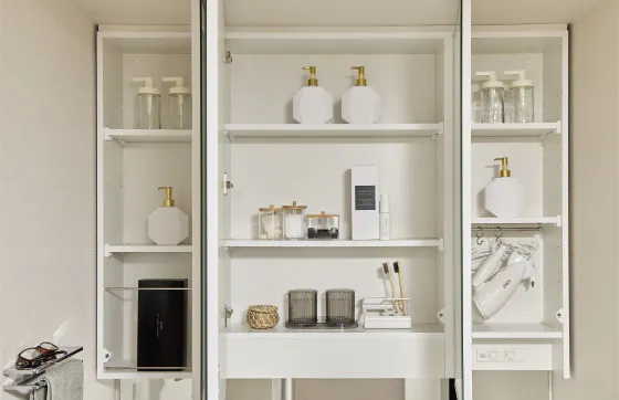 小物などを収納するスペースを鏡裏に確保しました。