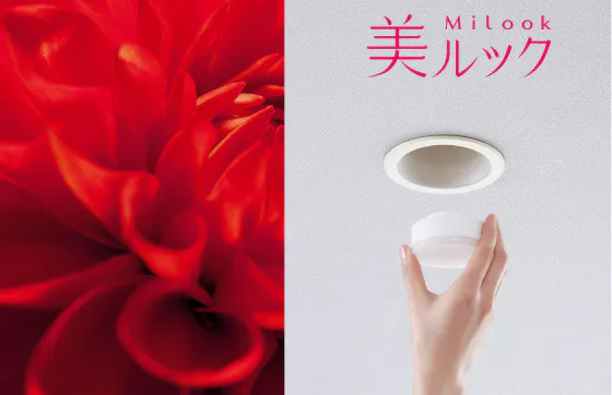 洗面化粧台上部のダウンライトには、本来の色を忠実に見せるあかり「美ルック」を採用。お肌の色味も素敵に見えるあかりです。