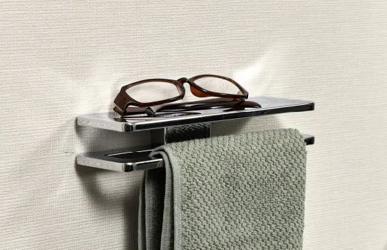 タオル掛けには、眼鏡やネックレスなどを一時的に置ける小物置を設けました。