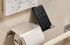 ペーパーホルダーには、スマートフォンなどを一時的に置ける小物置を設けました。