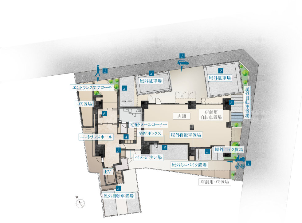 人と車、バイク、ミニバイク、自転車の通るルートを分けて敷地内の安全性に配慮した歩車分離設計です。