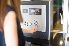 音声と画像により来訪者を確認してから共用エントランスを解錠。館内への不審者の侵入を防ぎ安全を確保します。
