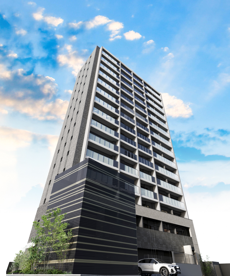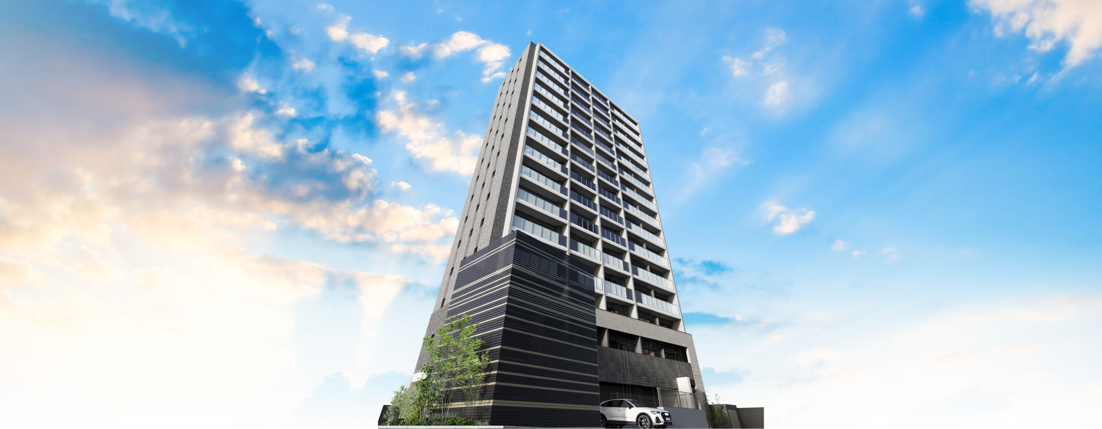 ファサードは、ダークトーンのタイルを基調にした落ち着きの中に、2種類のガラス手すりやルーバー手すりによって明るさやシャープさをデザイン。基壇部には、表情の異なるナチュラルで柔らかな風合いのタイルを貼り分け、邸宅の気品ある佇まいに仕上げました。