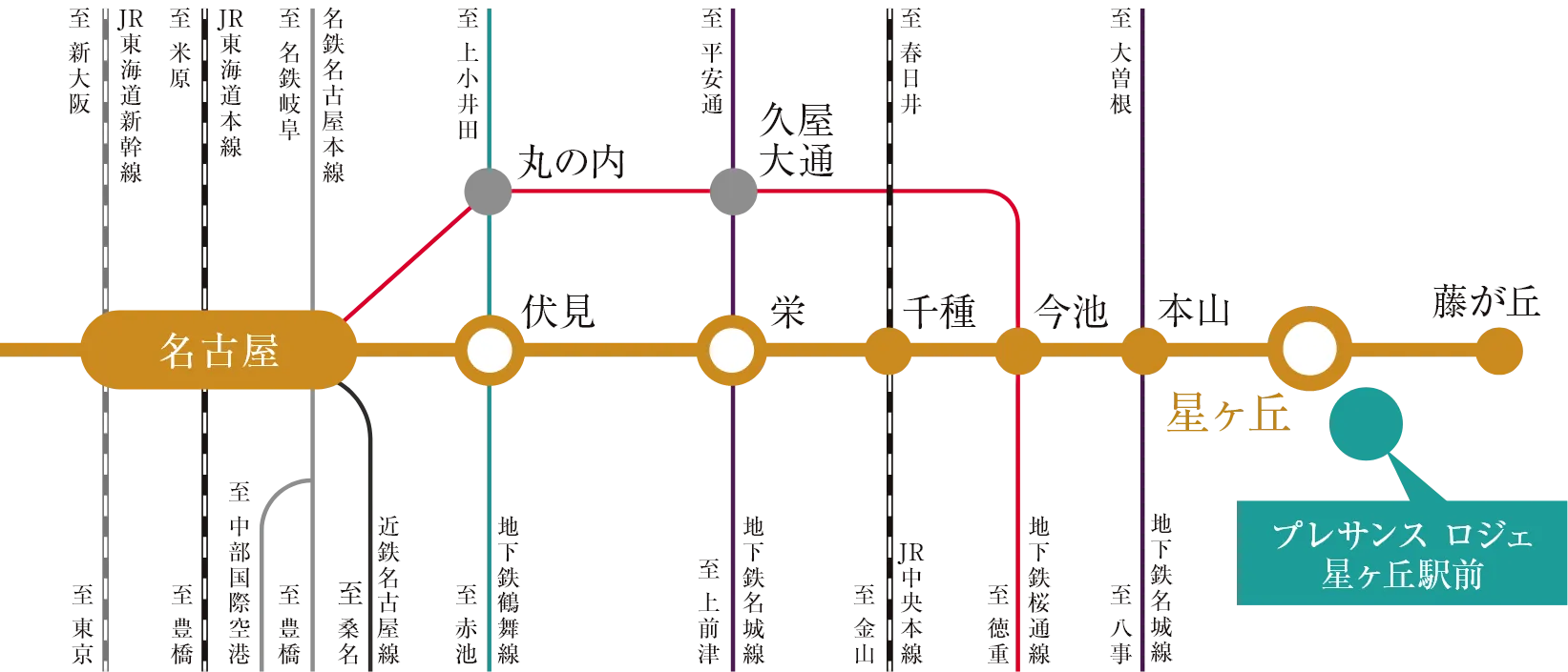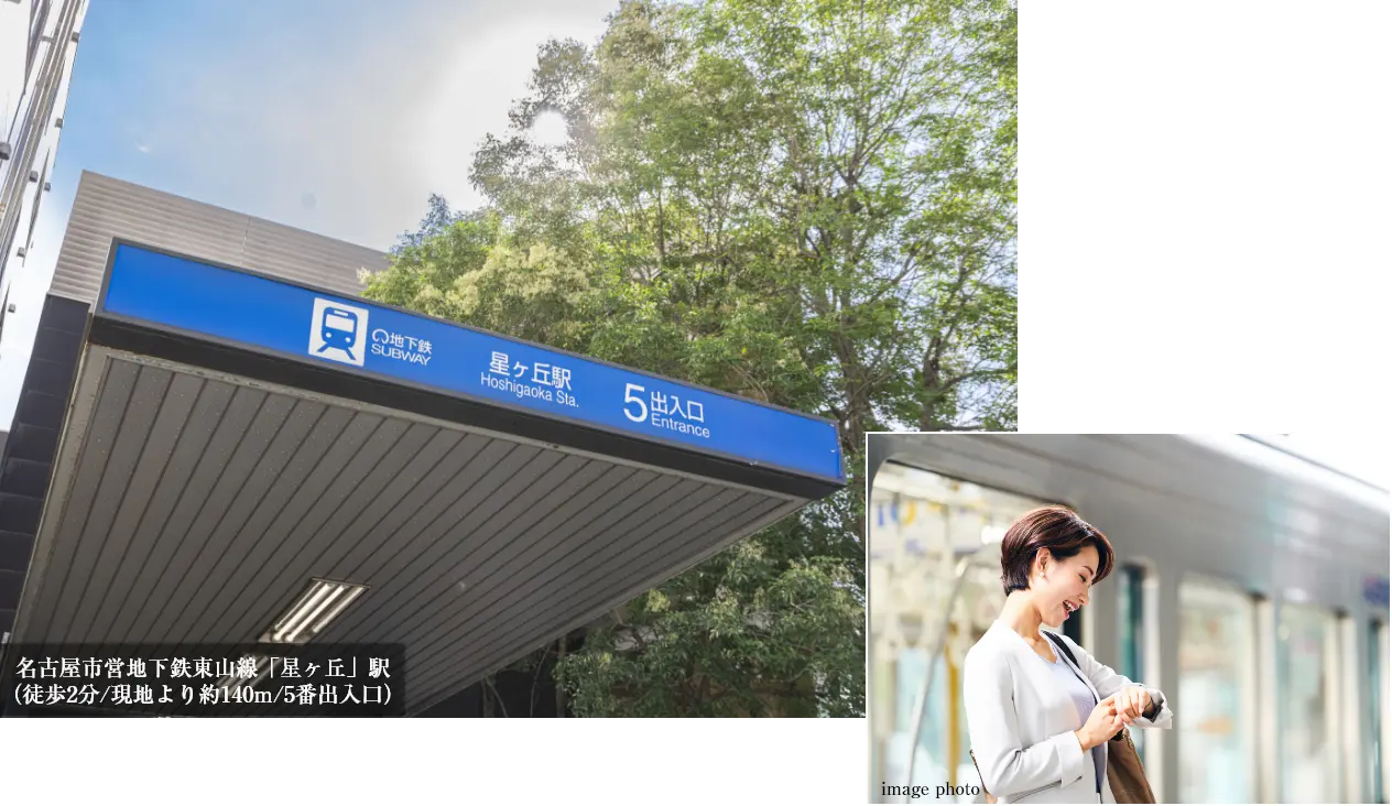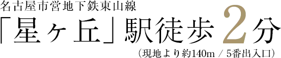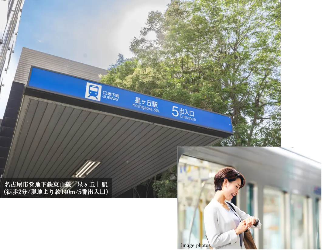 徒歩2分の名古屋市営地下鉄東山線「星ヶ丘」駅からは、「栄」「伏見」「名古屋」といった名古屋都心の主要駅へダイレクトにアクセスできます。