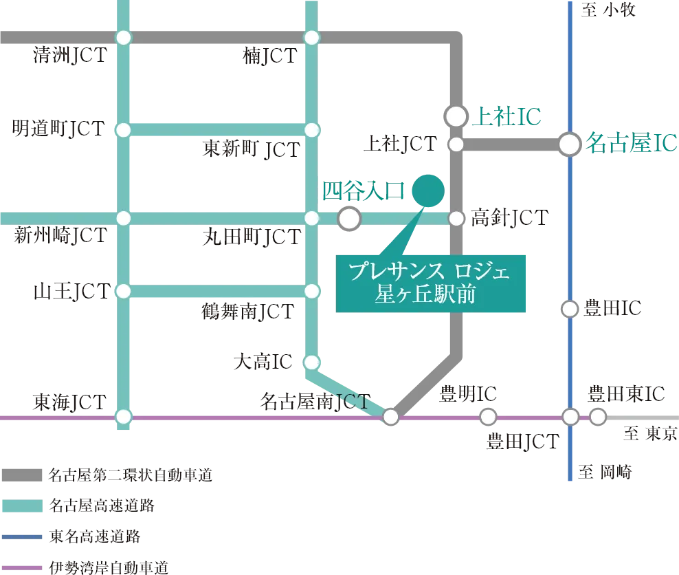 星ヶ丘の街を横断する東山通は名古屋市内を東西に結ぶ幹線道路で、西に向かえば栄エリアや名古屋駅エリアにつながり、東に向かえば東名高速道路「名古屋IC」や名古屋第二環状自動車道「上社IC」の利用が便利。