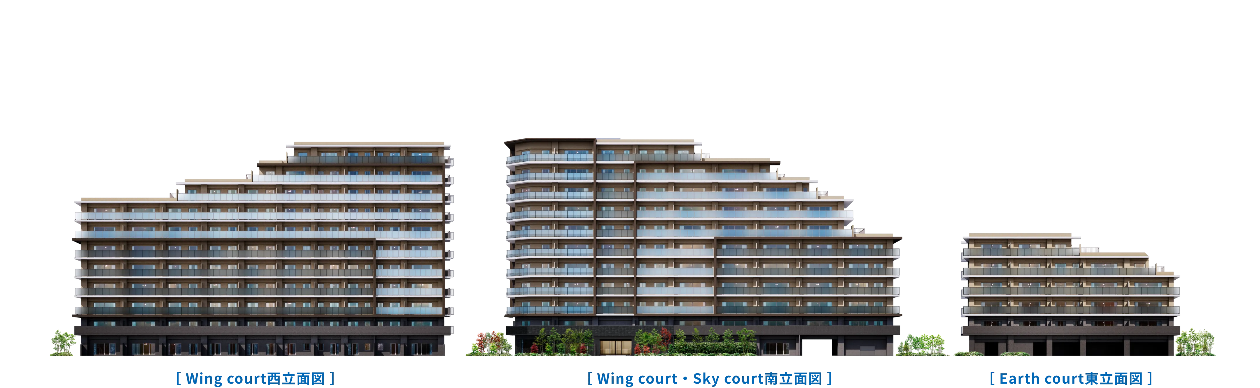 低層住宅が並ぶ街並みにやさしく寄り添う造形美。アースカラーを基調とした落ち着きある3棟が景観に溶け込み、