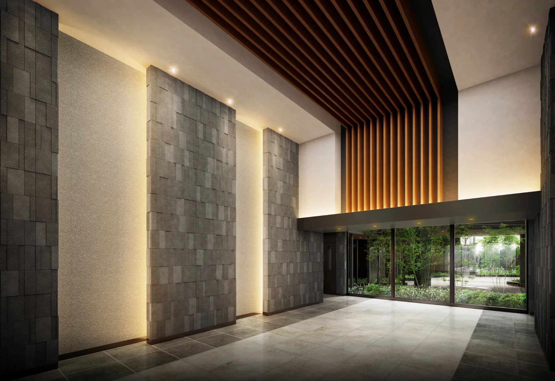 2層吹抜けの開放感あふれるホール空間。木調格子の天井デザインが奥行きを生み出し、外の緑景へと視線を誘います。間接照明の柔らかな光が調和をもたらし、静けさと気品が調和した、豊かさを語る空間です。