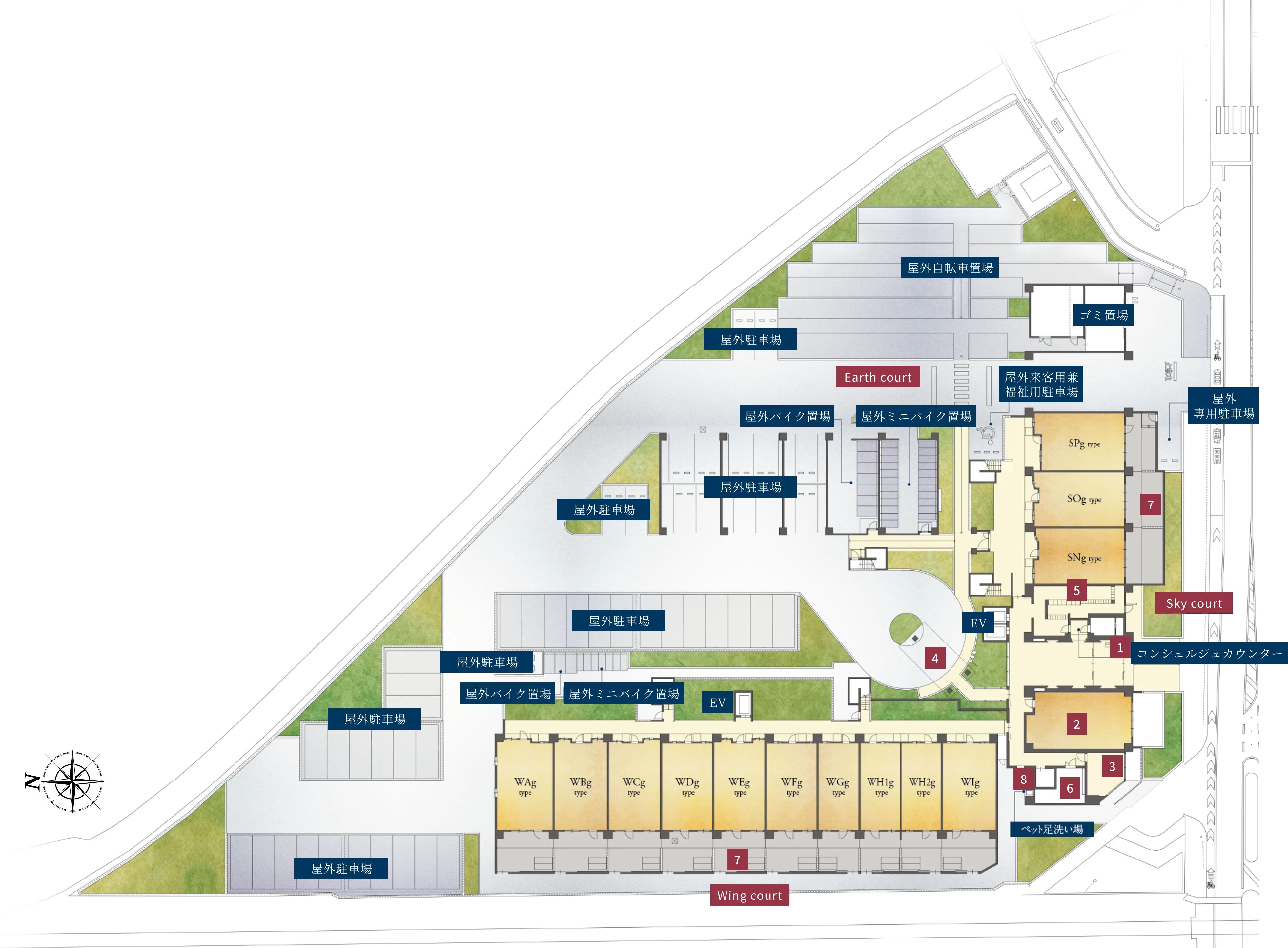 ゆとりある3棟構成と車寄せ付きロータリーを配置。