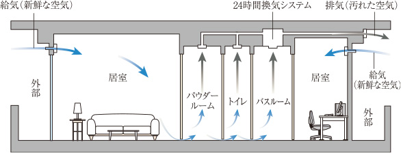 快適な室内空気環境を保つために、常に居室の給気口から外の新鮮な空気を取り入れながら低風量で強制換気を行い、室内の汚れた空気や臭い、湿気を外に排出します。