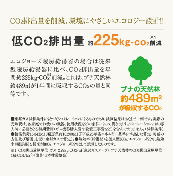 燃焼ガスを再利用することで高効率の給湯と暖房を実現。省エネ設計だから光熱費がお得。さらに不要な排熱もカットして二酸化炭素排出量を削減する、お財布にも地球にも優しい暖房給湯器です。