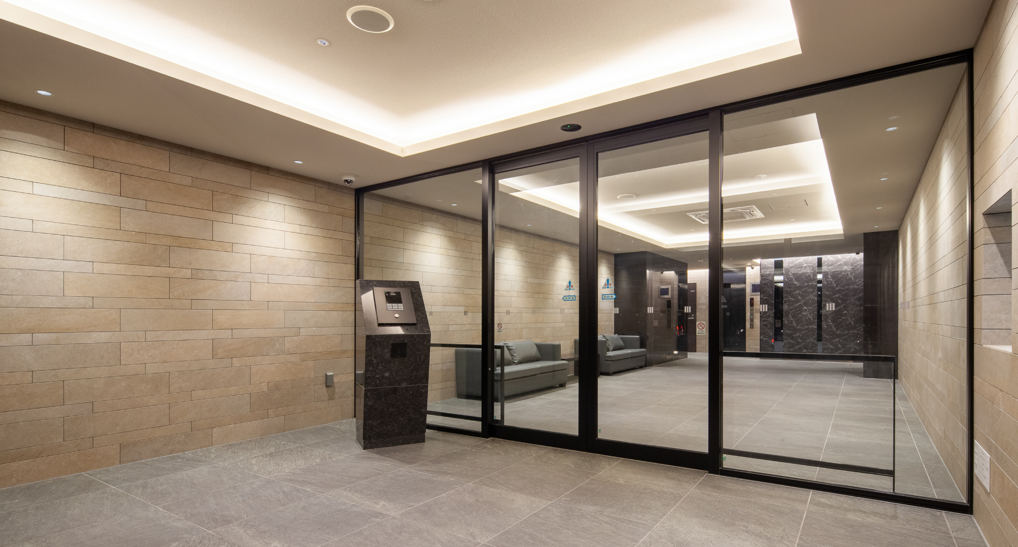メインのセキュリティバリアとなるオートロックシステムを設置し、ガラスのドア越しに広がる視界には、