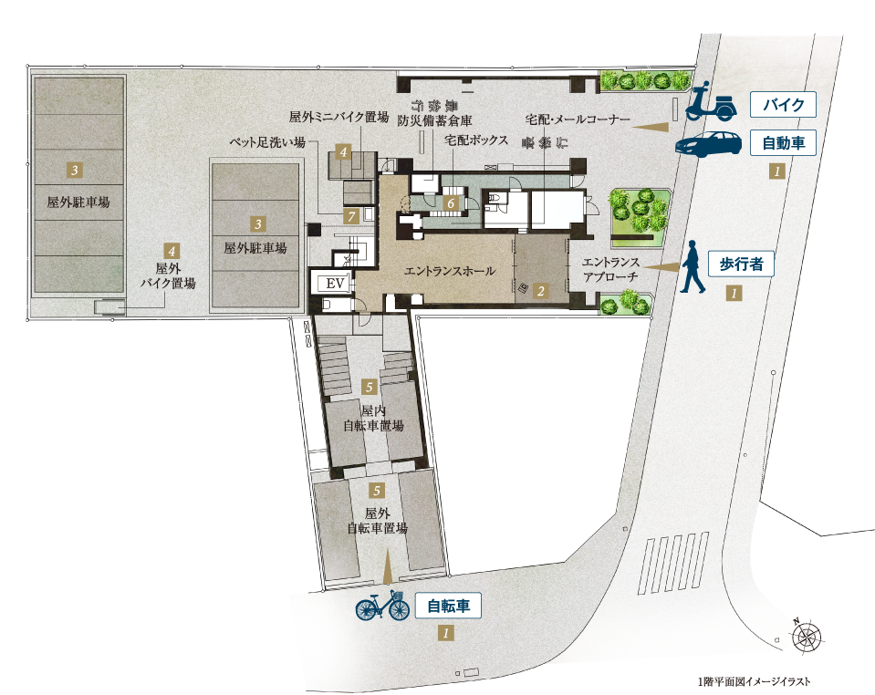 人と車、バイク、自転車の敷地内動線を分けて安全性に配慮した歩車分離設計を採用。