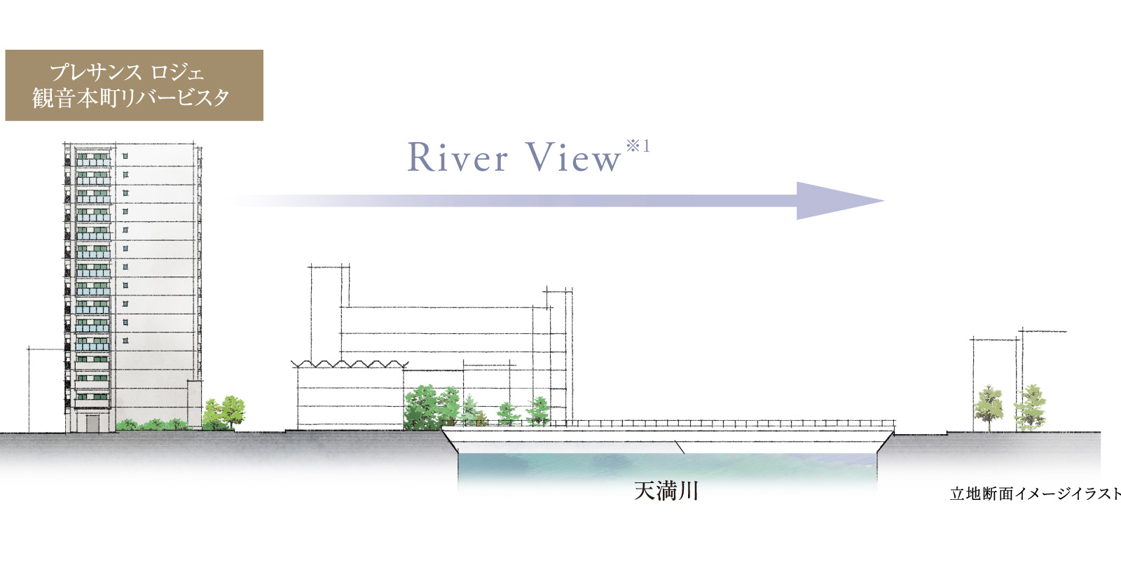 天満川を隔てることで、落ち着いた住宅街が広がる暮らしの舞台です。