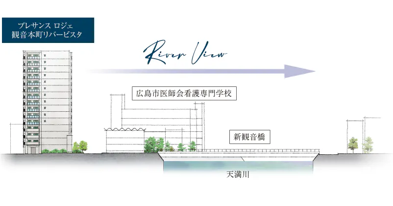 南向きに視界が開け、陽光と開放感はもちろん、リバービューの潤いあふれる水景と、