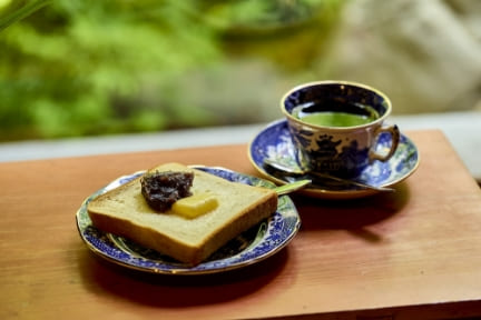 抹茶茶腕は、京焼・清水焼作家 上坂善妙の作品など、菓子皿は京菓子司 金谷正廣と六兵衛窯の清水 宏章氏が手がける「flat plateKyoto」、和菓子は「京菓子司 金谷正廣」の上生菓子。小腹が空いたときには黄金色のバターがとろりとろけるあんバタートーストを。喫茶の時間の中で、京都の伝統やクラフトに触れることができます。
