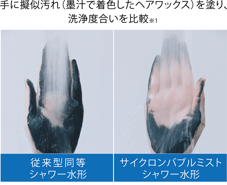 ※1 サイクロンバブルミストシャワー水形(シャワー孔φ0.43mm×72個+ミスト孔φ0.7mm×12個)とタカギ従来型と同等のシャワー水形[ 既存製品と同等仕様( シャワー孔φ0.6mm×150個)をキレイストのスクリーンサイズで再現]を使用し、擬似汚れ(墨汁で着色したヘアワックス)を塗布した人工皮膚に水流(静水圧0.3MPa)を5秒間あて、流れ落ちた擬似汚れ(墨汁で着色したヘアワックス)の重量を比較した結果(2020年10月タカギ開発調べ)