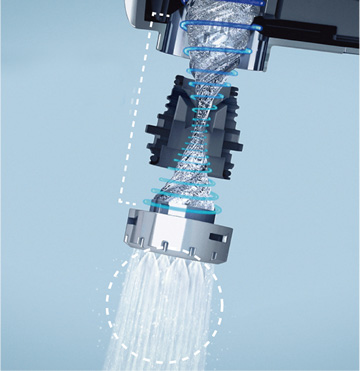 水形の中心がサイクロンバブルミストシャワー水形、その周りを取り囲むようにストレートシャワーを配置した新しい水形です。取り囲むストレートシャワーがカーテンのような役割を果たしミスト水形特有の気になる「水の飛び散り」を抑えるので、快適にご利用いただけます。