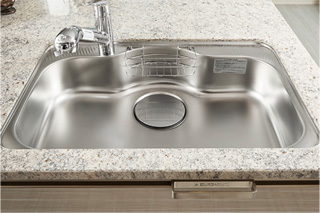 静音シンク大きな鍋などもラクに洗えるワイドシンク。シンクの裏側に制振材を備え、水はね音などを抑える静音タイプです。