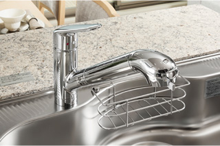 レバー水栓シンク内のお手入れに便利なハンドシャワータイプの水栓。いつでもおいしい水をすぐに利用できる浄水器も内蔵しています。