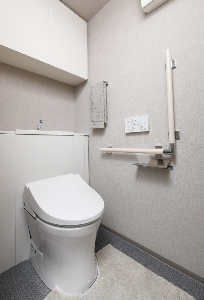 キャビネットを備えたシステムトイレを採用。空間をすっきり広々とさせます。暖房便座・洗浄などの機能はウォシュレットの壁付リモコンでラクに操作。脱臭はもちろん、立ち上がり後、自動で強力脱臭に切り替わるオートパワー脱臭を備えています。