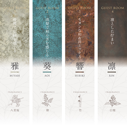 上質なる迎賓空間のゲストルーム。4室のゲストルームには、「雅」「葵」「響」「凛」のテーマを一室ごとに設え、お客様をお迎えします。