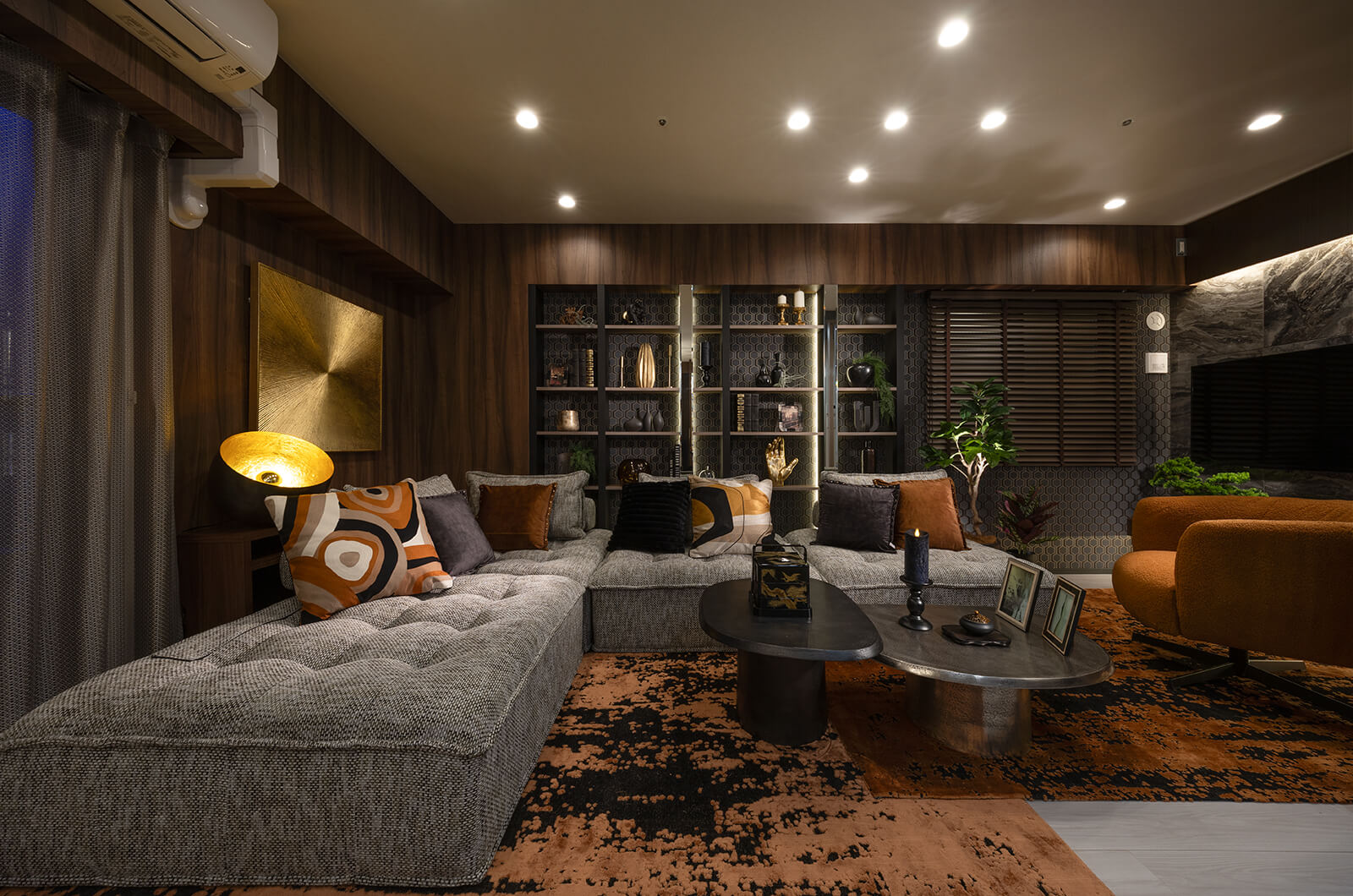 足元を柔らかに照らす間接光と、丸く陰影を落とすダウンライトに導かれるコリドー。