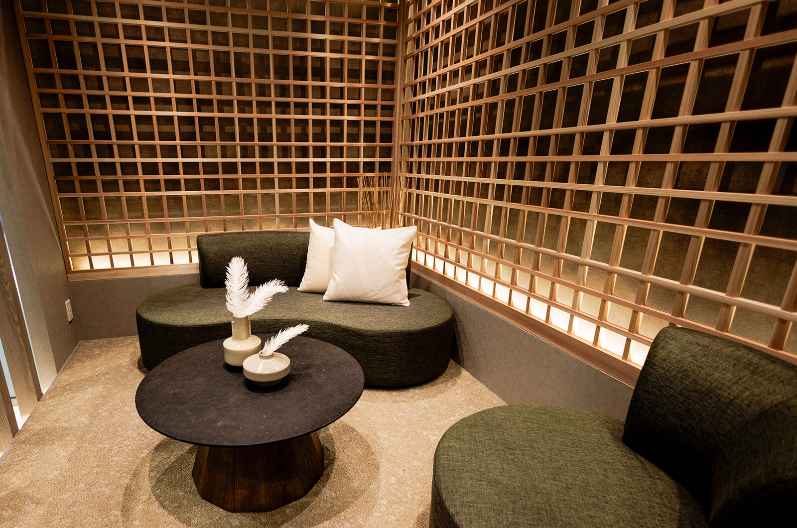 曲線美と柔らかな光に包まれた上質な空間。お電話やお子さまのお昼寝など、ご来場中のひと息にお使いいただけます。