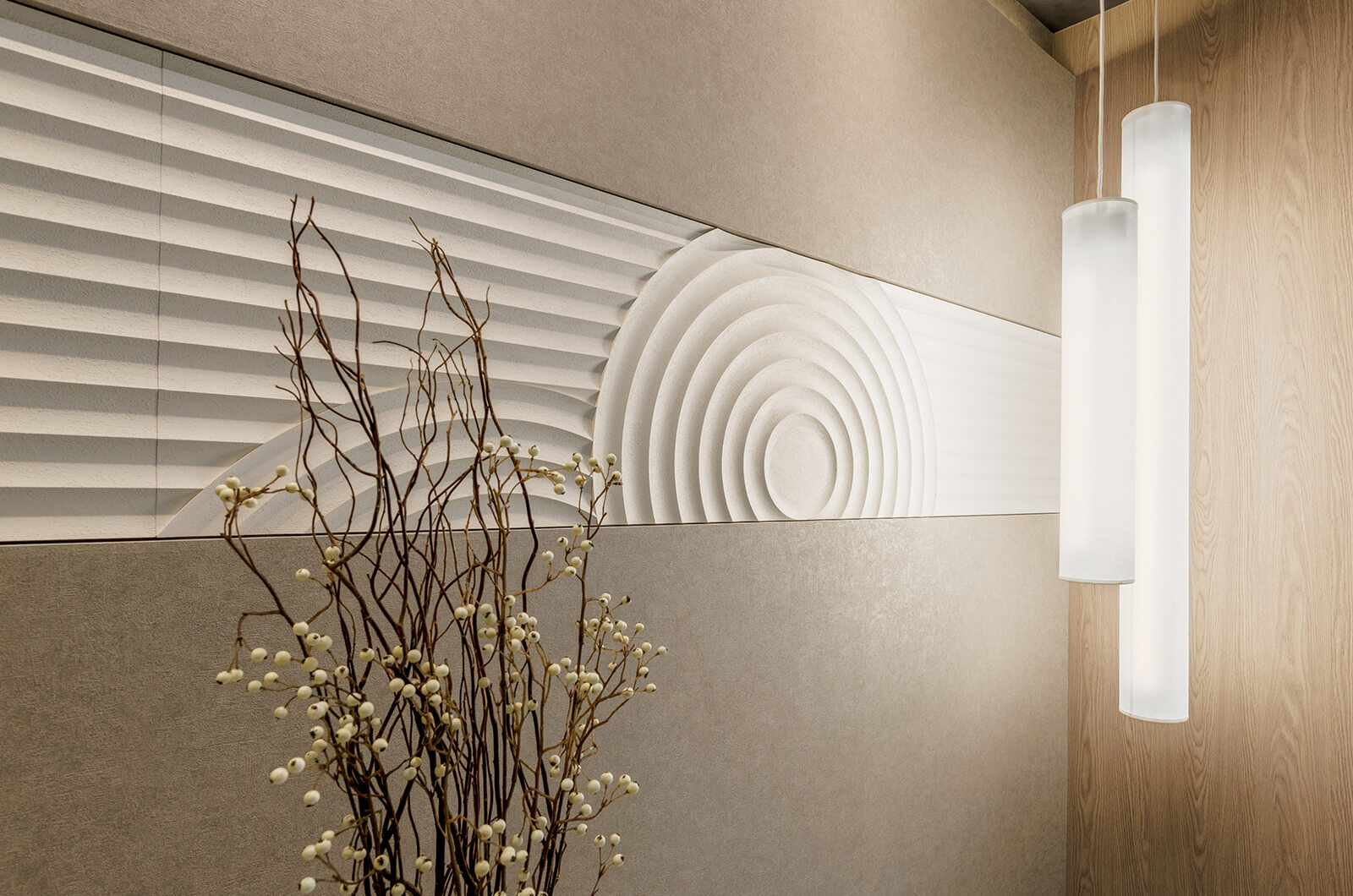 ゆったりと間口を広げたエントランスホール。枯山水の趣を写し取った大判のデザインウィールを中心に、静謐な佇まいのカウンターやアートをしつらえ、訪れる方を穏やかな美意識の中へと誘います。
