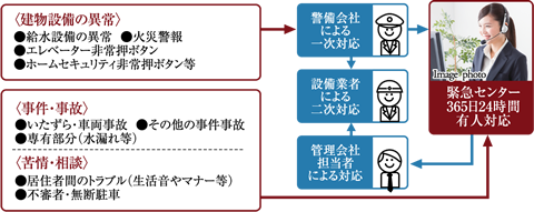 管理組合や居住者からの連絡や相談、設備の異常や事故・トラブルなどの緊急事態に備えて、365日24時間体制で管理会社の緊急連絡センター(フリーダイヤル)が対応いたしますので安心です。問い合わせや対応状況などは、管理会社独自のシステムに登録され、一元的に集約・管理されています。
