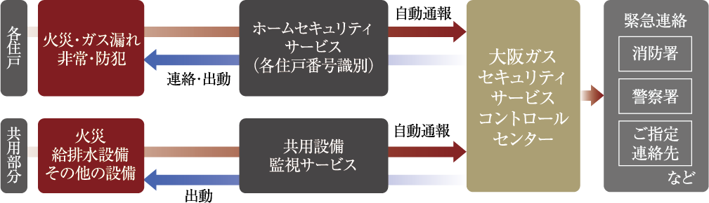 火災感知器やガス漏れ警報器による異常検知、セキュリティインターホンの非常ボタンによる通報、防犯(マグネット)センサーによる侵入検知などで、コントロールセンターに自動通報。状況に応じて警備員が駆けつけ、迅速・的確な対応を行います。