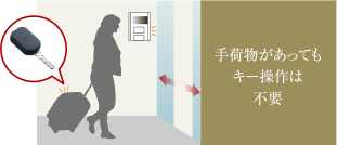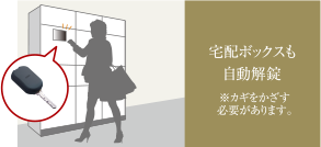 鞄やポケットに入れた鍵を取り出すことなく受信機へ近づくだけで(宅配ボックスのみ受信機にかざす)オートロックを解錠可能。