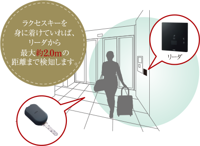 (参考写真)Raccessキーをポケットやバッグに入れるなどして身に着けているだけで、リーダから最大約2.0mの距離まで検知し、エントランスドアを解錠。両手が荷物でふさがっていても、キー操作することなくスムーズに通過できます。
