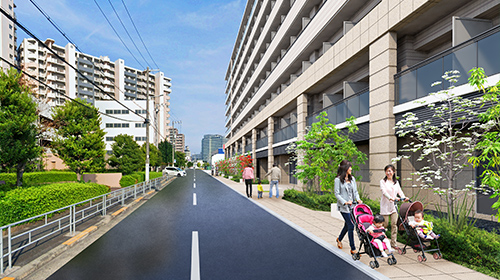 緑のプロムナード(歩行空間)。城東区からつづく既存遊歩道~区民広場をつなぐ歩行空間を整備することにより、周辺アクセスの利便性向上や、災害時の避難通路として防災機能の向上に寄与します。